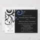 Bold and striking modern contemporary black wedding invitations with white and periwinkle cornflower blue accents, with delicate swirl scroll leaf background. Customise online with your wedding details.