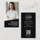 Black Contemporary Photo QR Code Logo Vertical Business Card. This modern vertical business card features full black backgrounds on both sides with clean white fonts and minimalist white details for a sharp, professional look. The front highlights your photo, company logo, name, and title or business name in a crisp layout that feels bold and streamlined.