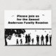 A graphic of people at an outdoor picnic is displayed on a black and white postcard invitation. Personalise the invitation with your own family name printed above the graphic and other reunion information on the reverse side.