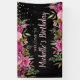 Elegant, pink and purple watercolor floral and green leaves on black custom birthday party "Welcome" banner accented with gold glitter. Personalised with the name of the guest of honour. Contact me for help with customisation or to request matching or coordinating Zazzle products for your party.