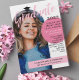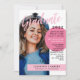 Retro graduation party invitation personalised with an arch-shaped photo on the cover and a second photo covering the back. Graduate written in pink brush script across the graduation invitation. Pale pink and pink accent colours. Stylish and girly graduation invitation in pink, white, and black.