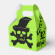 Black Poison Skull and Crossbones with a top hat on your choice of colour background Favour Boxes. Several fonts and colours to choose from. Fun lime green party favour gift box personalised Birthday Name age and "Thank You!" message. Perfect for Birthdays, Pirate or Rock and Roll Theme, and Halloween Treats! Fun matching customisable party favours available.