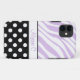 Custom iPhone 5 case personalised with your name, and designed with a black & white polka dot pattern and a light zebra print pattern with purple & white zebra stripes.