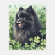 An adorable watercolor black Pomeranian dog laying a field of clover with a few shamrocks. A cute St. Patrick's Day gift for Pomeranian owners and pom lovers.
