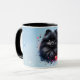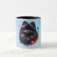 A highly detailed and vibrant illustration of a fluffy black Pomeranian dog, featuring expressive eyes and a soft, voluminous coat. The background is a dynamic splash of colourful watercolor splashes, creating an artistic and playful atmosphere. The dog's fur is accentuated, capturing the light and texture, emphasizing its adorable personality.
