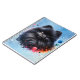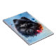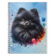 A highly detailed and vibrant illustration of a fluffy black Pomeranian dog, featuring expressive eyes and a soft, voluminous coat. The background is a dynamic splash of colourful watercolor splashes, creating an artistic and playful atmosphere. The dog's fur is accentuated, capturing the light and texture, emphasizing its adorable personality.