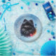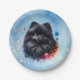 A highly detailed and vibrant illustration of a fluffy black Pomeranian dog, featuring expressive eyes and a soft, voluminous coat. The background is a dynamic splash of colourful watercolor splashes, creating an artistic and playful atmosphere. The dog's fur is accentuated, capturing the light and texture, emphasizing its adorable personality.