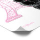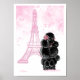 Cute little black poodle puppy with a pink Eiffel Tower in the background with pink fireworks