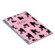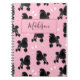 Cute Black Poodles Pattern with Bows and Hearts on Delicate Swirl Pattern a Soft Pink Background Notebook with Custom Name and Monogram.