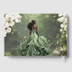 Personalize this enchanting Sweet 16 birthday real foil guest book easily and quickly. Simply click the Edit Using Design Tools button to further edit the text, change font styles and font colors. Featuring a black girl dressed in a sage green dress, a frog prince, beautiful trailing white floral and an enchanted forest and pond background. The girl, crown, little butterflies and frog are movable, resizable, multipliable and removable. Customize it to suit your occasion. For a seamless and coordinated look, explore our range of matching items available in-store. (c) Somerset Fine Paperie.