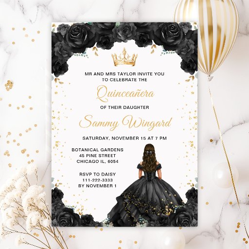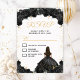 This elegant and glamourous Quinceañera rsvp card features a beautiful princess with dark hair in a black ball gown. The text combines handwritten script and modern sans serif fonts for a classy and sophisticated look. The floral arrangements, butterflies and gold confetti create the perfect blend of rustic and chic.