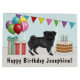Destei's original cartoon illustration of an adorable black coat colour Pug breed dog. The dog is placed in a colourful birthday setting. There is a birthday cake with some candles on it, colourful birthday balloons and a bunting banner as well as two present boxes. There is also a personalizable text area.