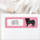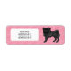 Destei's original cartoon illustration of a cute black coat colour Pug breed dog on a pink background colour with a pattern of hearts in different sizes. There is also a personalizable text area for custom address information or some other text.
