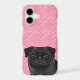 Black Pug Dog Head Close-Up On Pink Love Hearts