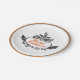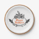 Halloween themed paper plates done in white, with a grey and orange ring around the outer edge and watercolor artwork of three creepy black pumpkins decorating an oval text area. Orange custom text reads Happy Halloween and can be changed to read what you want. Matching napkins and paper cups and other party supplies are available.