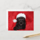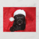 Black puppy with just a little bit of white on a red background and wearing a Santa hat dog lovers Christmas holiday, postcard