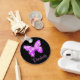 A butterfly shape filled with shades of purple and shining stars in horizontal stripes. Black background. Customise and add your name with purple letters.