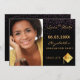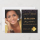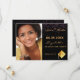 On front: Add your own vertical size photo of the graduate. A chic black background colour and purple confetti sprinkle. Templates for a name and date. Golden letters. The name and the text: Save the Date are written with a modern hand lettered style script. With a modern abstract faux gold cap, tassel topper.