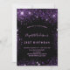 A girly and feminine 21st (or any age) birthday party invitation. On front: A chic black background. Decorated with dark purple faux glitter dust. Personalise and add a name and party details. The name is written with a hand lettered style script, light purple coloured letters.