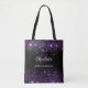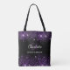 An elegant black background. Decorated with purple faux glitter dust. Personalise and add your first name, monogram initials and full name. The name is written with a hand lettered style script.