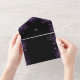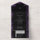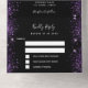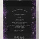 A trendy black background, decorated with sparkling purple faux glitter dust. Personalize and add your names, monogram and wedding details. White colored letters.