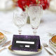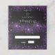 A modern and elegant. A black background decorated with purple faux glitter sparkles. Add your names on the back.