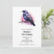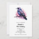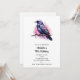 A birthday invitation with an image of a black crow with purple pink wings. A pink watercolor splatter behind this lovely mystical bird.