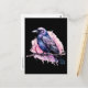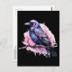 A postcard with an image of a black crow with purple pink wings. A pink watercolor splatter behind this lovely mystical bird.