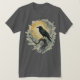 Watercolor-style illustration of a black raven resting on a twisted tree branch silhouetted against a glowing full moon with surrounding bare branches and moody sky