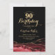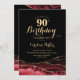 Black, red and gold agate 90th birthday party invitation. Elegant modern design featuring watercolor agate marble geode background, faux glitter gold and typography script font. Trendy invite card perfect for a stylish women's bday celebration. Printed Zazzle invitations or instant download digital printable template.