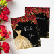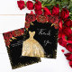 A feminine and elegant birthday thank you note. A black background, with faux gold glitter, sparkles, red roses and a golden dress. On front a large hand lettered script and the text: Thank You.