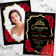 Black red gold Quinceanera celebration invitation. Features girl in ball gown dress, script font, red roses, tiara and glitter gold. Classy design with your photo on the back. Perfect for an elegant princess style glam celebration. Personalise with your own details. Printed Zazzle invitations or instant download digital printable template.
