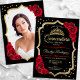Black red gold Quinceanera celebration invitation. Features script font, red roses, tiara and glitter gold. Classy design with photo on the back. Perfect for an elegant princess style glam celebration. Personalise with your own details. Printed Zazzle invitations or instant download digital printable template.