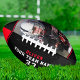 Black Red Name Number Team Photo Football. Personalize it with your photo, name, team name and year. The text is trendy white and red typography on a black background with a red stripe. You can change any text on the football or erase it. A perfect gift for a football player, teammates, coach. Great keepsake to remember your favorite sport.