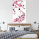Black red peacock and cherry blossoms custom wrapped canvas print, featuring a silhouette of a peacock bird and a cherry branch -sakura tree- with lovely flowers on white background. A design with an oriental Asian flair. Colours: Black red, white.