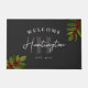 Welcome door mat in matte black personalised with your last name, initial, and the year your family or home was established. Muted black door mat with rowan berries and rowan greenery, your name in a signature script and welcome in curved text. Rowan welcome mat in green, red, and matte black. Autumn welcome mat with rowan greenery.