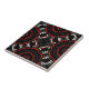 Unique decorative tile design featuring red and white geometric ornaments on a black background.