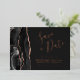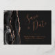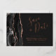 This elegant modern save the date card features a black watercolor agate border trimmed with faux rose gold glitter. The customisable text combines real rose gold foil handwriting script, copperplate and italic fonts on a dark background. The reverse side features a matching black and rose gold agate design.