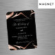 A black background. Decorated with rose gold marble veins. Personalise and add your names and party details. White text.