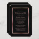 Minimalist black and rose gold celebration of life invitation featuring event details inside a rose gold frame on the front and a photo at the back.