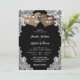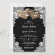 Black rustic country wedding invitation featuring two burlap hearts, string lights and white floral lace. Perfect card design for your black rustic wedding party.