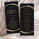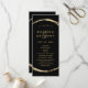 This wedding program features a faux gold circle frame with an elegant ampersand and simple calligraphy with a black background.