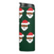 A personalised name Christmas thermal tumbler with a Black Santa face illustrated pattern on a green background. Simply customise the name, add this tumbler to your cart, and have a merry Christmas!