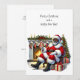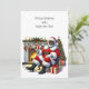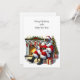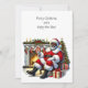 Digital illustration of Black Santa sitting in front of a fireplace with a tree, gifts, and stockings. Text can be customised or removed, including message and address of your business on back. AI assisted graphic purchased with commercial use. Artwork: DreamCafeArt