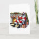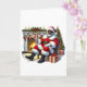 Digital illustration of Black Santa sitting in front of a fireplace with a tree, gifts, and stockings. Text can be customised or removed, including message and address of your business inside. AI assisted graphic purchased with commercial use. Artwork: DreamCafeArt