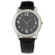 This men's watch has an art deco design of white half circles connect with lines on a field of black.
