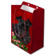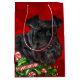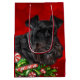 Black Schnauzer face on a red background with Christmas goodies peeking out of the corner dog lovers Christmas holiday gift bag