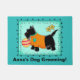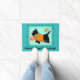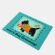 Show a great and cute welcome for your dog pet grooming business with this colourful turquosie teal green doormat at your entry. The words and name are fully customisable and can be personalised to your business name or other words. Great business promotion and marketing. This rug features a whimsical black Scottie Terrier that is wearing an orange tee shirt with turquoise teal trim. A yellow and red ball is beside him or her. The background is turquoise teal blue stripe with a teal border with black paw prints. A serpentine line border is inside the teal border. Two yellow flowers are above the dog. This cute, cuddly and trendy dog is original art by Phyllis Dobbs and will melt the heart of a dog lover. This Scottie dog door mat is fully customisable to promote your business!