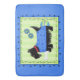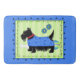 Show your dog love with this rug mat. This rug features a whimsical black Scottie Terrier that is wearing a blue sweater coat with tonal blue stars and a red collar. A lime green and turquoise ball is behind the Scottie and a large white dog bone is at his or her front paw. The background is a lime green tonal stripe pattern. A serpentine line border surrounds the dog image to make a stylish, trendy and custom decorative Scottish terrier dog art. Three turquoise teal blue flowers are above the dog. The art is on a blue background. This cute, cuddly and trendy dog is original art by Phyllis Dobbs and will melt the heart of a dog lover. This Scottie is one of a series of 6 Scotties and all are fully customisable to make it your own! Coordinate with matching products.