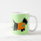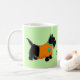 Enjoy drinking your coffee or other favourite beverage from this cute mug with a black Scottie Terrier on a light green background. Personalise with your dog's name or change to your name or other words. This whimsical black Scottie Terrier is wearing an orange tee shirt with turquoise teal trim. The Scottie dog is on both sides of the mug with the name in the centre. This cute, cuddly and trendy dog is original art by Phyllis Dobbs and will melt the heart of a dog lover. This Scottie is one of a series of 6 Scotties on coordinating products and all are fully customisable to make it your own!